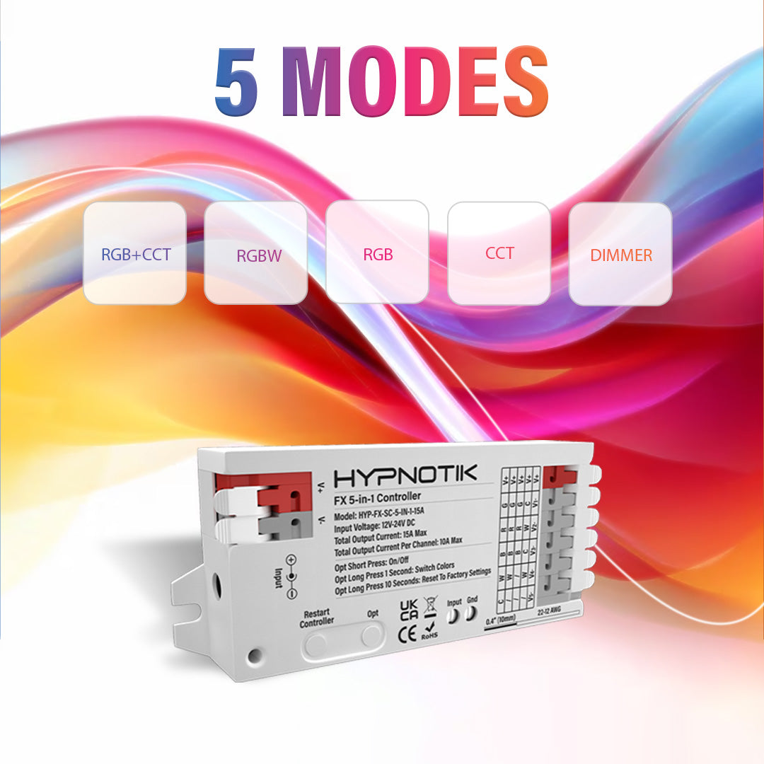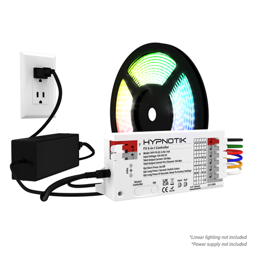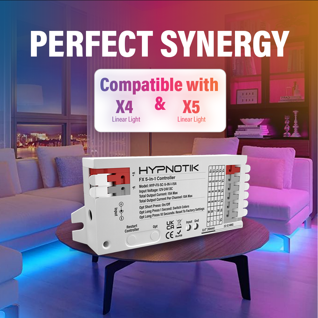 Take complete control of your linear lighting with unmatched versatility and seamless integration. The Hypnotik FX 5-in-1 Controller connects, powers, and controls all your linear lighting products with professional-grade performance, supporting up to 15A total output and multiple control methods for the ultimate lighting experience.