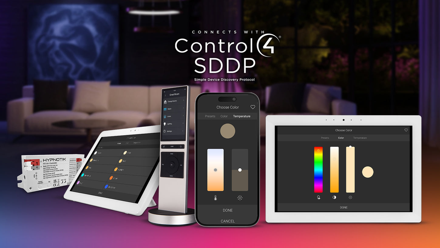 Hypnotik is the perfect match for Control4 enabled homes. Our products natively support Control4 Simple Device Discovery Protocol (SDDP) for a streamlined integration experience. Our interface drivers bring multi-colored lighting control to Control4 touch screens.
